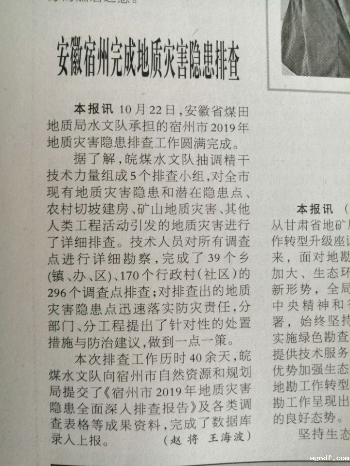 安徽宿州完成地质灾害隐患排查——见2019年10月29日中国自然资源报地质勘查版