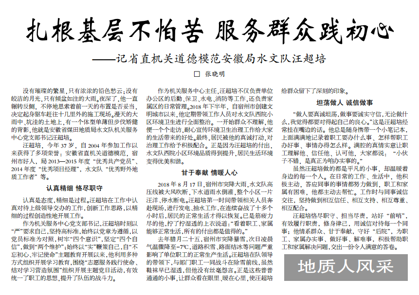 扎根基层不怕苦 服务群众践初心——记省直机关道德模范安徽局sgndf汪超培(见2019年10月28日中煤地质报第三版头条)