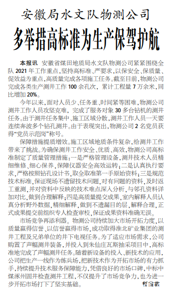 安徽局sgndf物测公司多举措高标准为生产保驾护航——见2021年6月16日中煤地质报第二版
