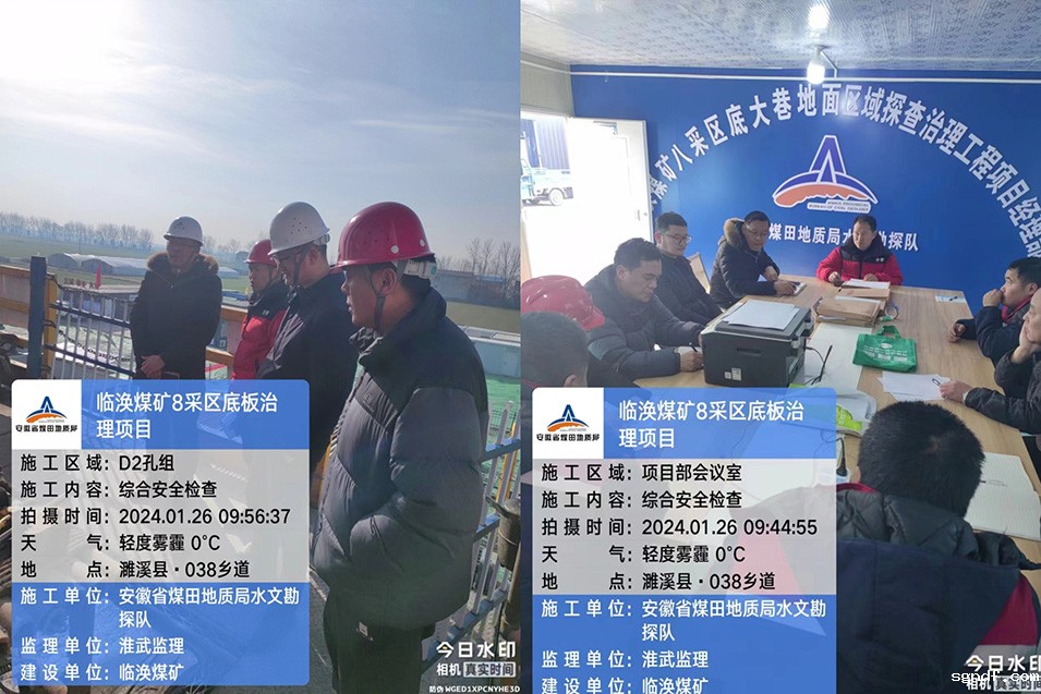 1月26日上午,临涣煤矿地测科科长李林、经管部支部书记孟奎、安监处副主任周维亮与该项目经理代涛在sgndf临涣煤矿八采区底大巷地面区域探查治理工程联合开展安全消防专项检查。